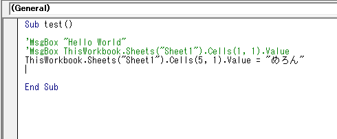 ThisWorkbookのSheets(“Sheet1")のCells(5, 1)のValue(値)に「めろん」という文字を入力した、といったかんじです。