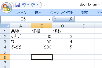 まずは、前回作った「Book1」ファイルのSheet1にテストデータを作りましょう。