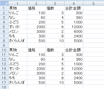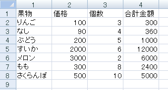 fruitArray = [{"果物","価格","個数","合計金額";"りんご",100,3,300;"なし",90,4,360;"ぶどう",200,5,1000;"すいか",2000,6,12000;"メロン",3000,2,6000;"もも",300,8,2400;"さくらんぼ",500,10,5000}]
