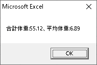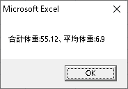 MsgBox "合計体重:" & weightTotal & "、平均体重:" & weightAvegage