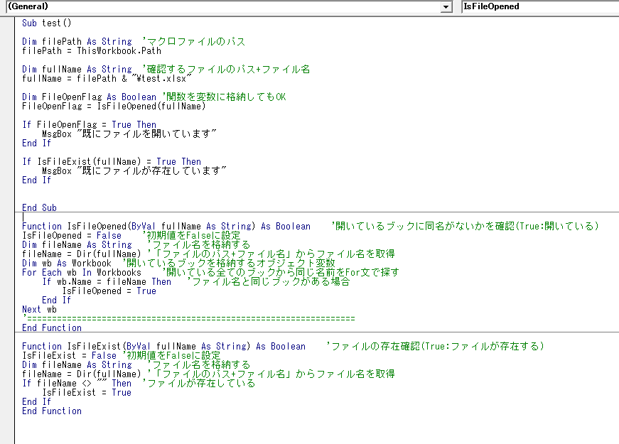 以下がその関数を使ったコードになります。使い方ですが、まずファイルが開かれているかどうか確認する関数が「IsFileOpened」になります。こちらにファイルのパス+ファイル名を渡して使います。開かれていればTrue、開いていなければFalseを Boolean型で返します。